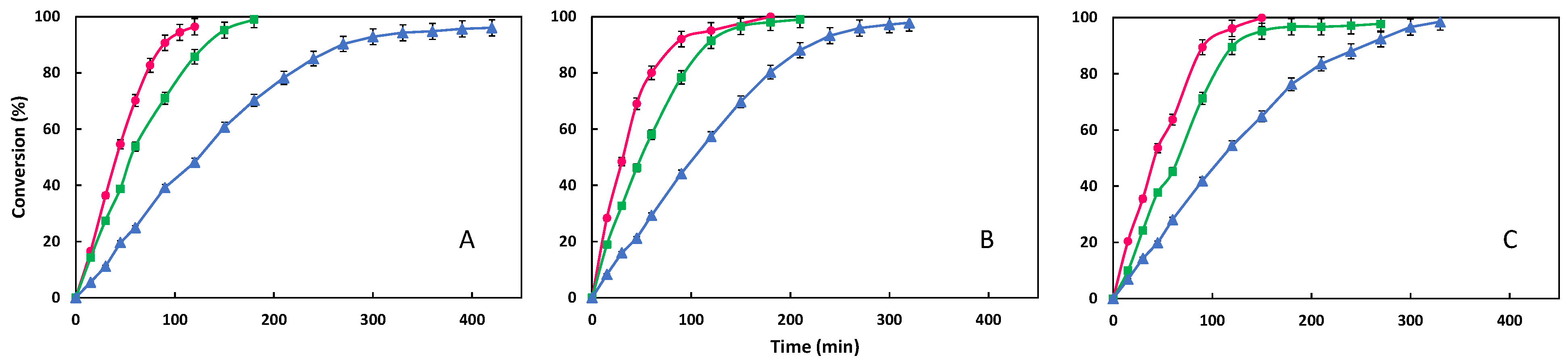 | Ester | Temperature (°C) | Average Rate at 30 min (min−1) | Time to Conversion up 95% (min) |