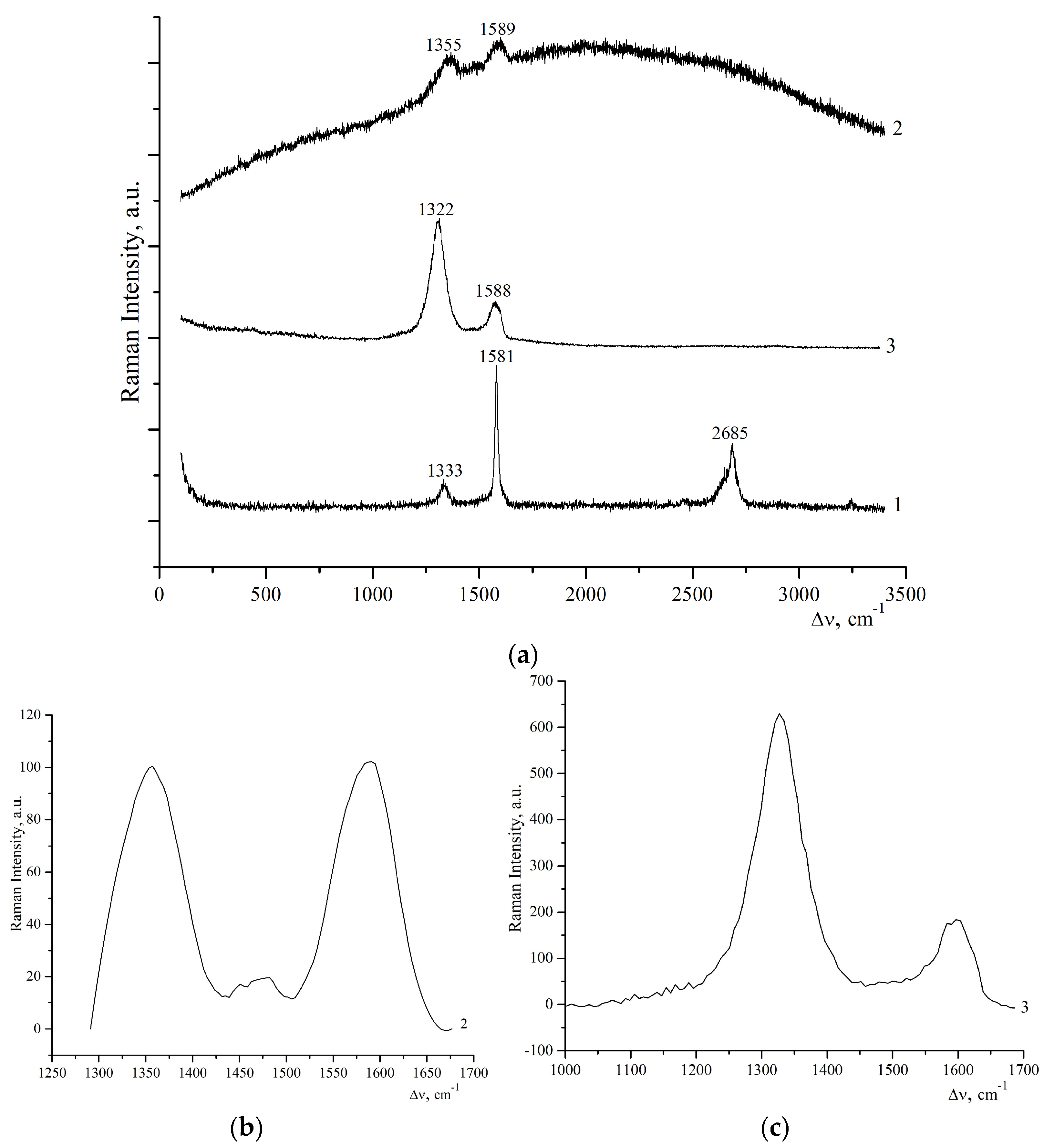 - Cançado, L.G.; Takai, K.; Enoki, T.; Endo, M.; Kim, Y.A.; Mizusaki, H.; Jorio, A.; Coelho, L.N.; Magalhães-Paniago, R.; Pimenta, M.A. General equation for the determination of the crystallite size of nanographite by Raman spectroscopy. Appl. Phys. Lett. 2006, 88, 163106. [Google Scholar] [CrossRef]
