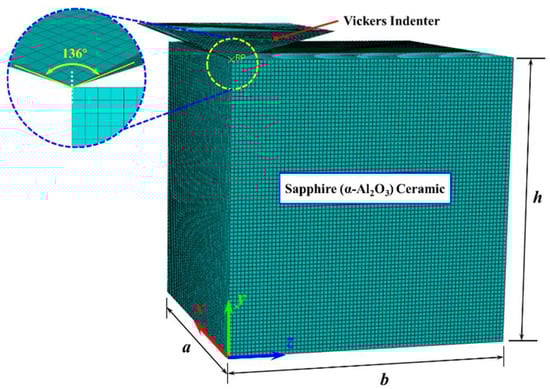 Taking precedence over the ensuring of computational accuracy and the reduction in the computational memory, the rigid body can be equated to the diamond indenter, owing to the consideration that the mechanical performance of the diamond indenter is much larger than that of sapphire. All simulations in this work employ a consistent base unit system of μm-μg-μs. From this foundation, the density is expressed in 1 × 109 kg/m3, stress in GPa, acceleration in 1 × 106 m/s2, and force in 1 × 10−3 N, with all other physical quantities deriving accordingly. Considering the symmetry of the orthotropic, a quarter sapphire ceramic workpiece was taken as the simulation model, with a size of 300 μm × 300 μm × 300 μm. In addition, the full size of the Vickers indenter simulation model is directly taken without symmetry treatment. The full-size finite element model of the diamond Vickers indenter and a quarter finite element model of sapphire ceramics are illustrated in Figure 3. Given that the indentation process induces significant plastic deformation on the sapphire surface, an adaptive mesh was defined in critical regions. This strategy prevents computational failure due to excessive mesh distortion and ensures the output of precise results. During the Vickers indentation process, the friction between the diamond indenter and the sapphire ceramic will be generated due to mutual contact. In consideration of the limited influence of friction on the final result, the average value f = 0.12 is taken as the friction coefficient input into the model [,]. The initial contact point between the diamond indenter and the sapphire is set as the coordinate origin. The coordinate system setting of the finite element simulation model is consistent with the crystal orientation coordinates in Figure 1. The load transferred through the Vickers indenter was applied on the sapphire along the O-y direction, and the set load was consistent with the experimental value.