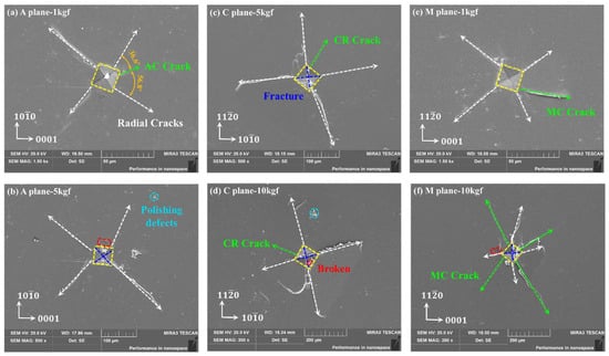 Sapphire Vickers indentation surface morphology with multiple crystal orientations through SEM: (a) 1 kgf of A-plane, (b) 5 kgf of A-plane, (c) 5 kgf of C-plane, (d) 10 kgf of C-plane, (e) 1 kgf of M-plane, and (f) 10 kgf of M-plane.