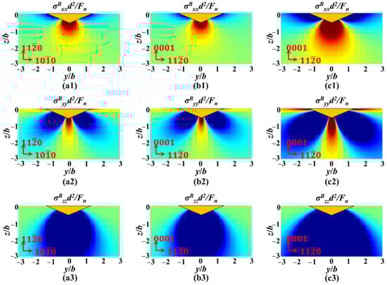 The parameters in Figure 18 are consistent with the crystal orientation and load in Figure 16. Due to the difference in Poisson’s ratio, the tensile stress along the loading direction and perpendicular to the loading direction of sapphire in a-orientation is greater than that in c-orientation under the same load, as illustrated in Figure 18(a1–a3,b1–b3). Meanwhile, σBzz is insensitive to Poisson’s ratio; therefore, its inhibitory effect on median cracks is similar under the same load. Hence, sapphire in a-orientation is not only more prone to nucleation and propagation of median cracks but also promotes further propagation of radial cracks. Furthermore, under the same direction, an increase in normal load will cause an increase in all principal stresses, thus promoting both median and radial cracks, as illustrated in Figure 18(b1–b3,c1–c3).