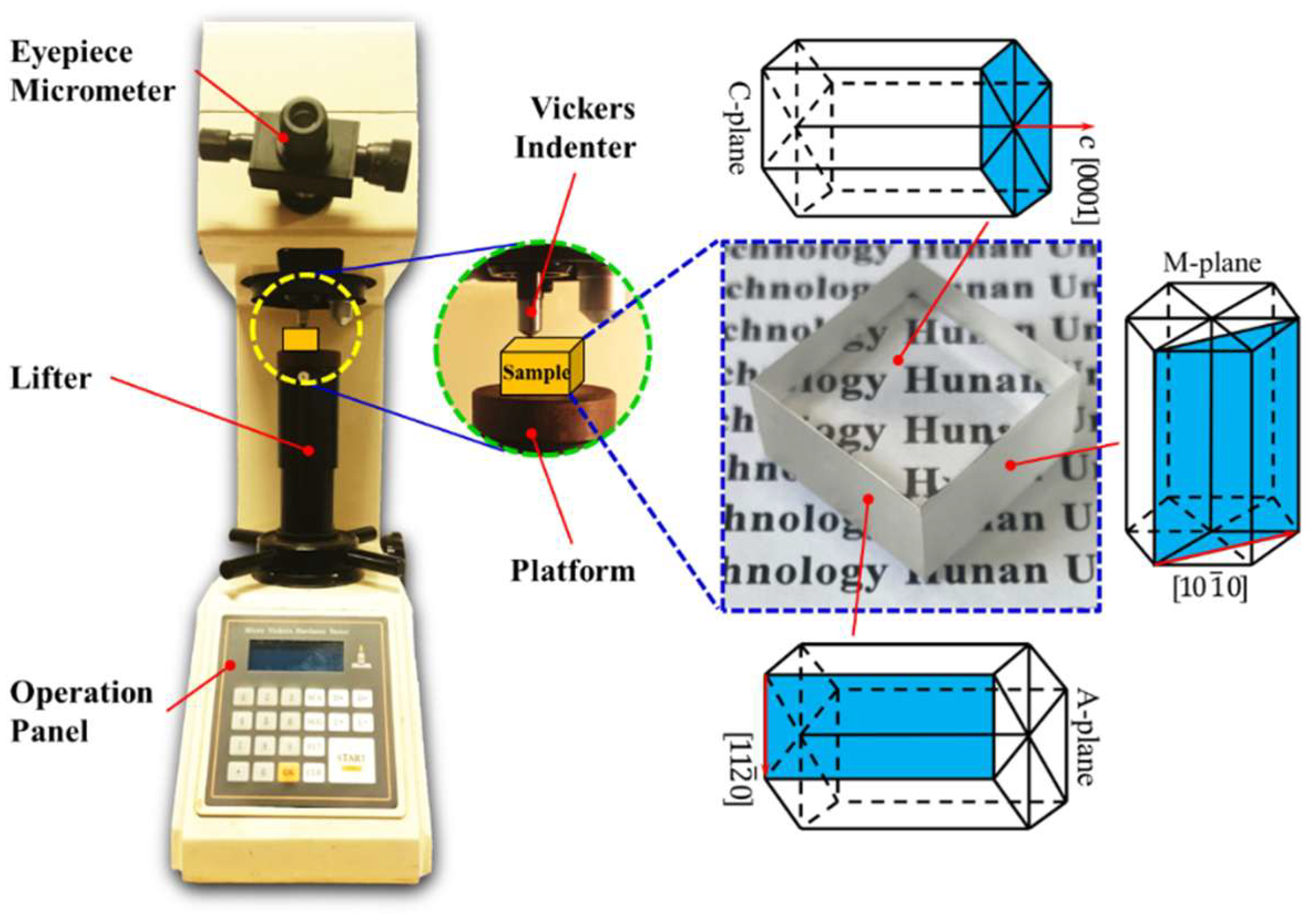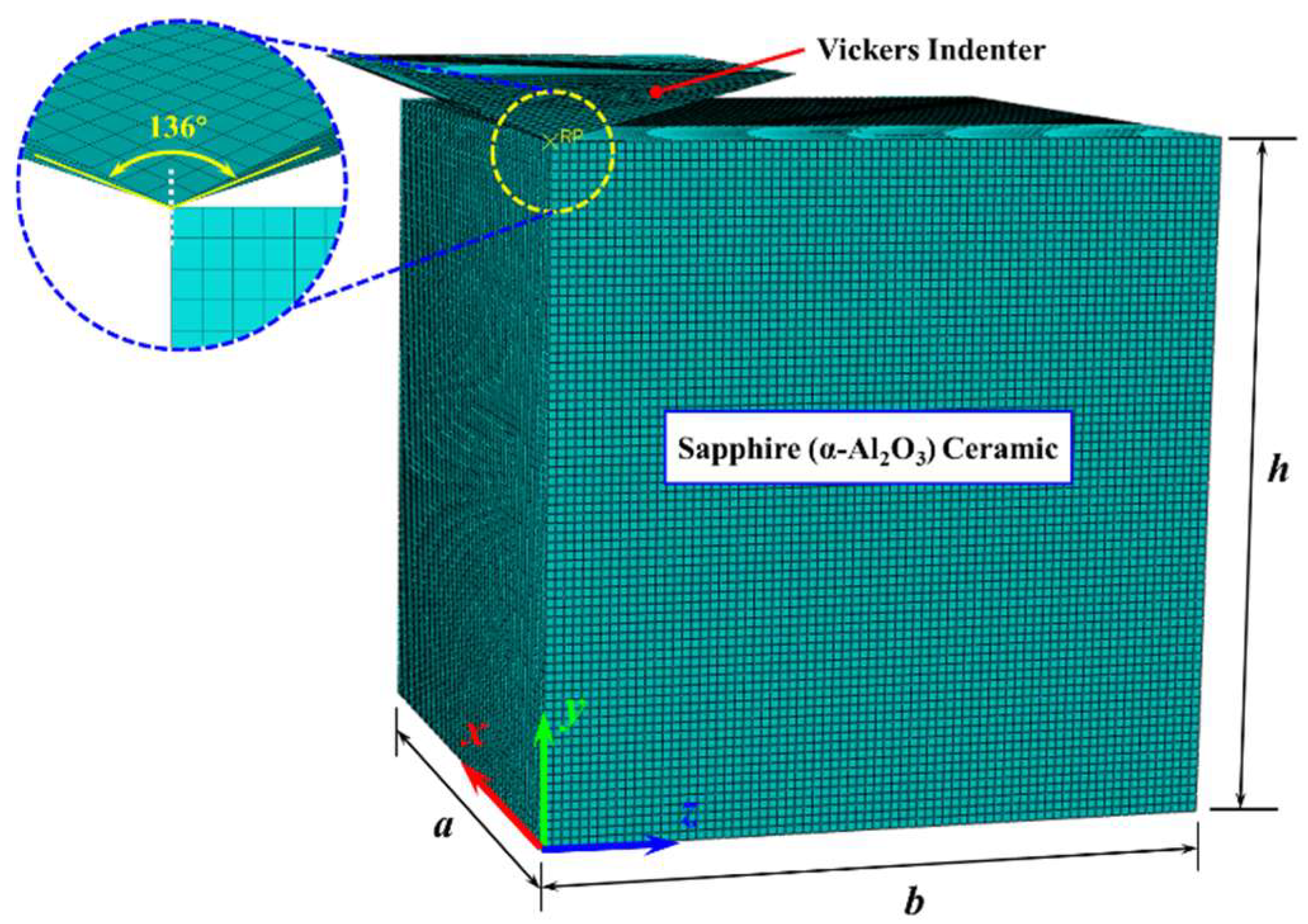The Vickers indentation test utilized sapphire (α-Al2O3) ceramic blocks produced by Xuzhou Hengsheng Semiconductor Material Factory (Xuzhou, China), which were inspected for the crystal orientation using an orientation instrument (Beijing Shuaiyi Technology Co., Ltd., Beijing, China) after production. Sapphire is a typical difficult-to-machine ceramic material with anisotropic properties. The hexagonal unit cell diagram of sapphire, shown in Figure 1, illustrates that the three crystal orientations a [], c [], and m [] of sapphire are orthogonal. The Vickers indenter is made of diamond, and the force is transferred to the sapphire surface through the loading process (loading, holding, and unloading).