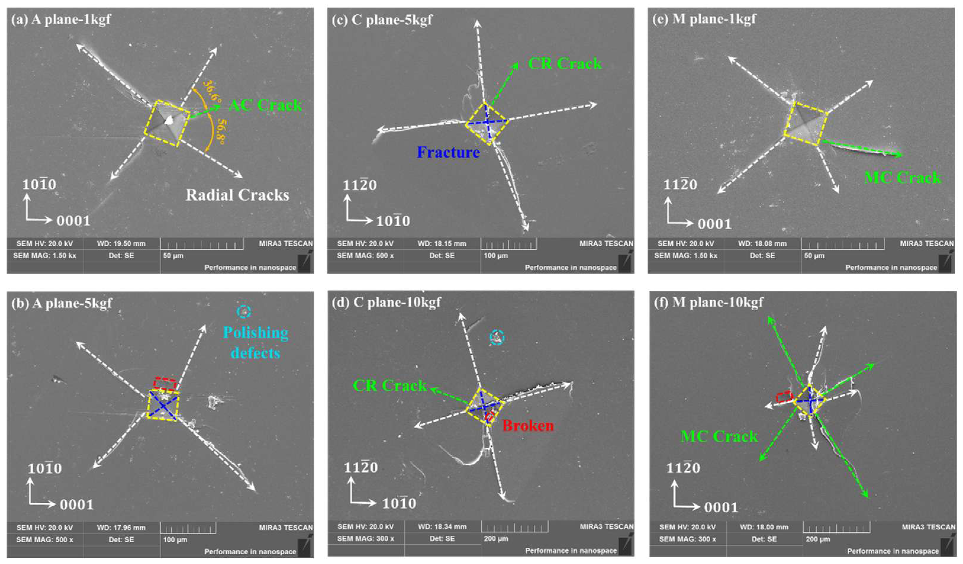 Vickers indentation surface morphology of sapphire under 20 and 30 kgf load by SEM: (a) 20 kgf of A-plane, (b) 30 kgf of A-plane, (c) 20 kgf of C-plane, (d) 30 kgf of C-plane, (e) 20 kgf of M-plane, (f) 30 kgf of M-plane.