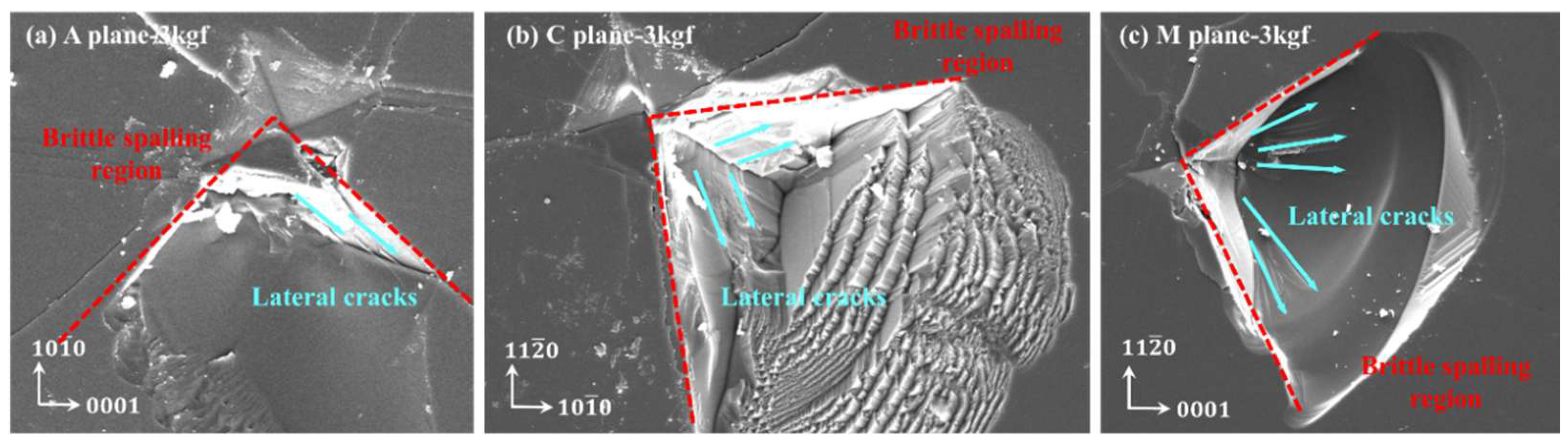 When the load was 3 kgf, material peeling occurred in all three crystal orientations of sapphire, as illustrated in Figure 6. This should be due to unevenness during the loading process. However, through the morphology of the peeling area, it can be seen that due to slight changes in the loading angle, the force in a certain quadrant is biased, and a large number of lateral cracks nucleate and propagate, ultimately resulting in material peeling in this quadrant.