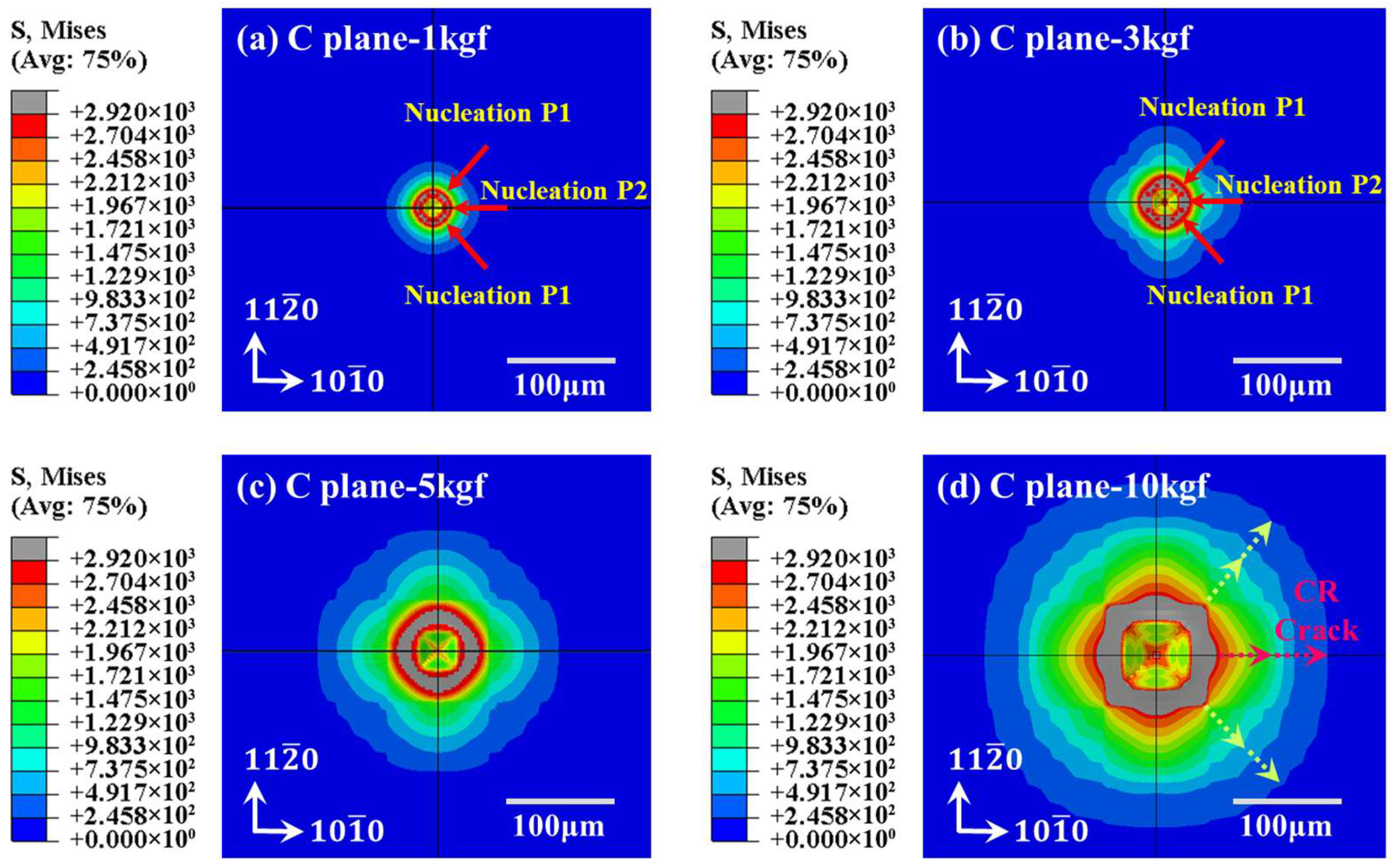 Figure 8 is the von Mises stress nephogram of the entire surface of the C-plane sapphire Vickers indentation under different loads. The sapphire surface is indented into a square area by Vickers indentation and varies by load. On the positions of diagonals, boundaries, and vertices, the sapphire yield strength is inferior to the value of von Mises stress. And positions with excessive stress values between the two diagonals also existed, which is similar to the indentation phenomenon obtained in Figure 5. Furthermore, both Figure 5 and Figure 8 demonstrated that under the existing parameters, the significant degree of stress concentration and the area of the zone exhibited a positive correlation with the applied load.