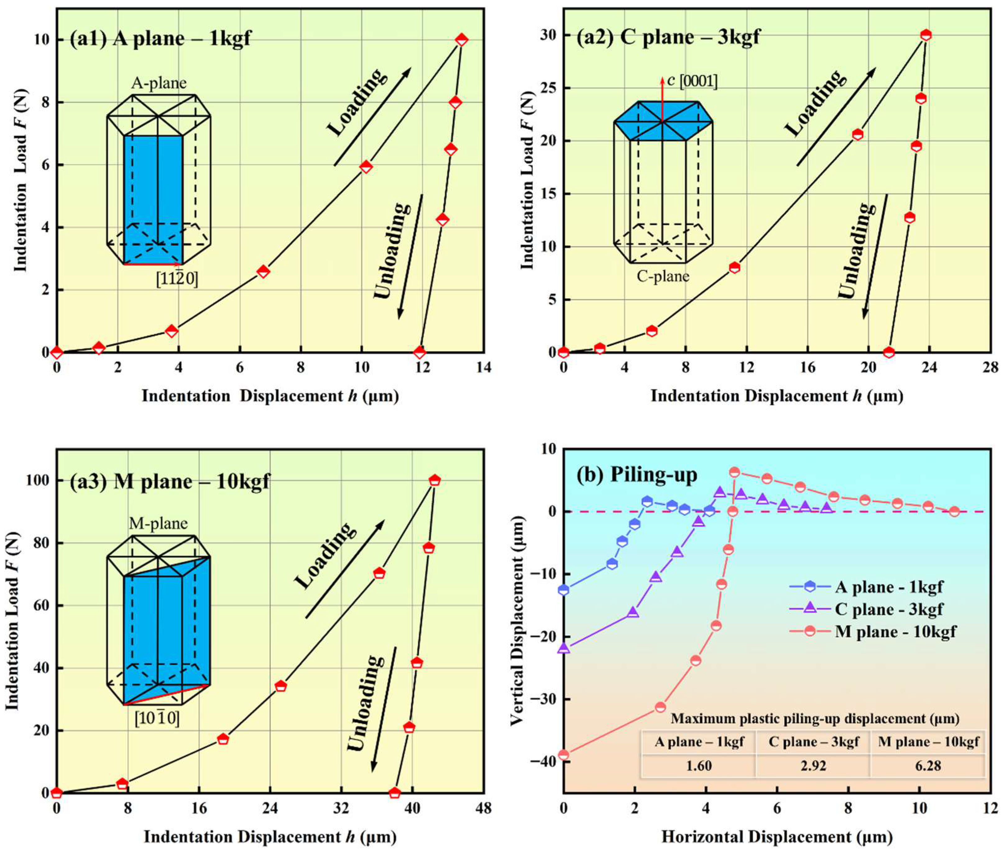 Load–displacement curve of Vickers indentation: (a1) A-plane sapphire under 1 kgf load, (a2) C-plane sapphire under 3 kgf load, (a3) M-plane sapphire under 10 kgf load, (b) plastic piling-up displacement curve.