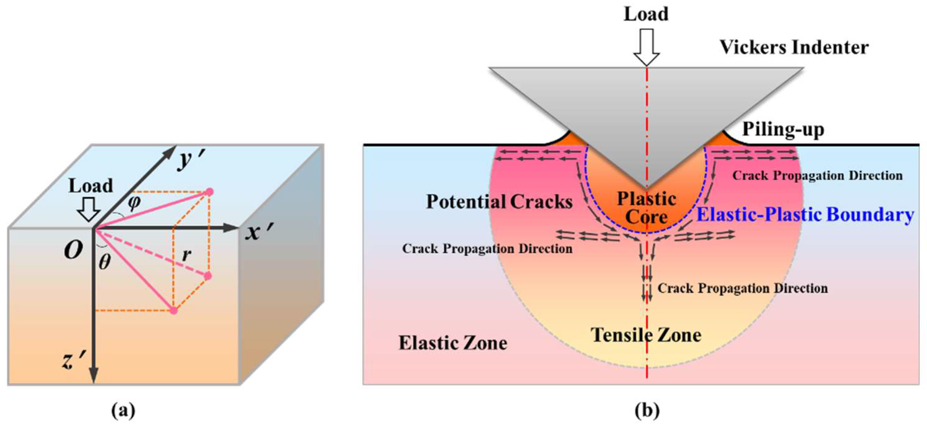 Stress field of sapphire Vickers indentation: (a) spherical coordinates and (b) indentation stress field and cracks.