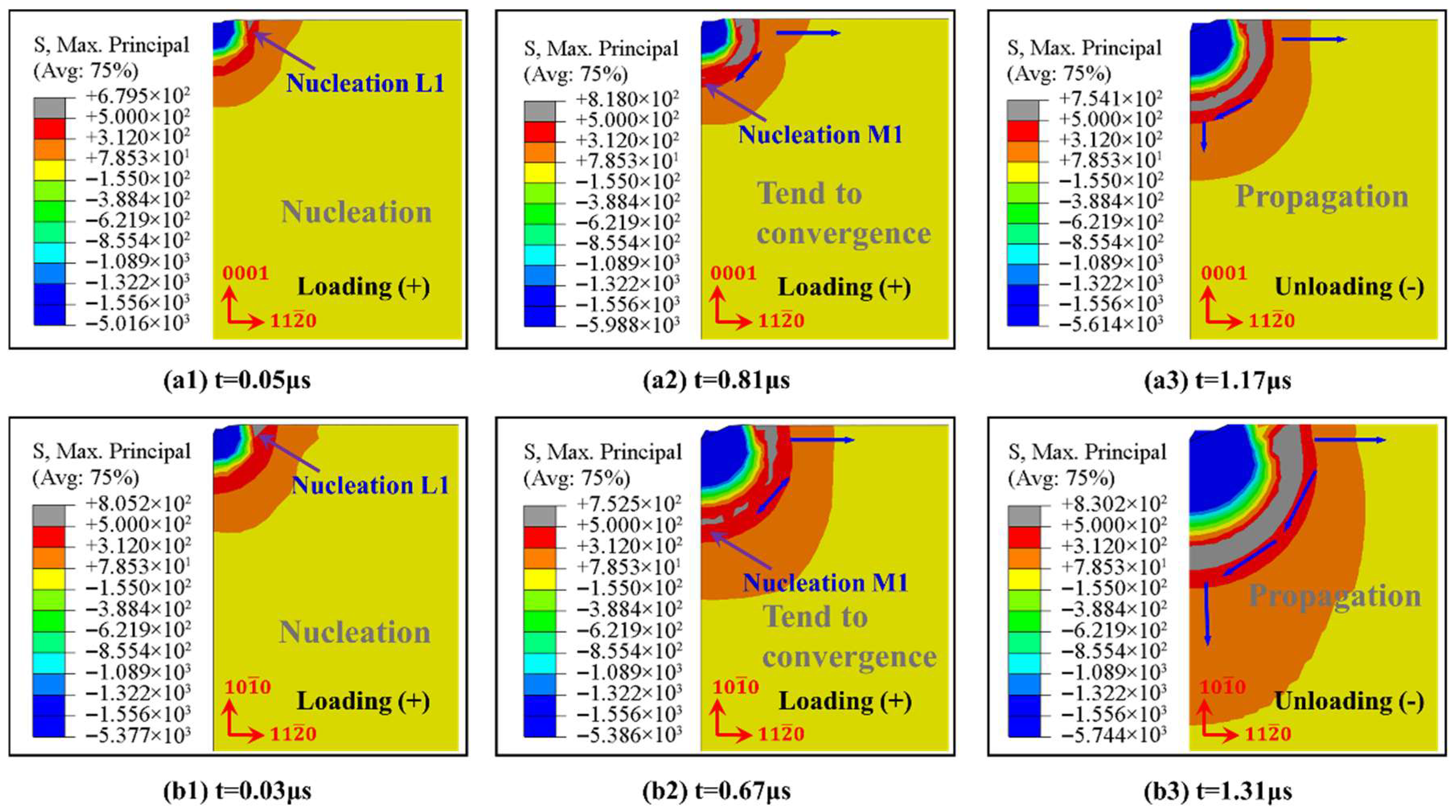 Nucleation and propagation of indentation cracks in Vickers indenter during loading and unloading of C-plane sapphire under 3 kgf load (a1–a3), M-plane sapphire under 10 kgf load (b1–b3).