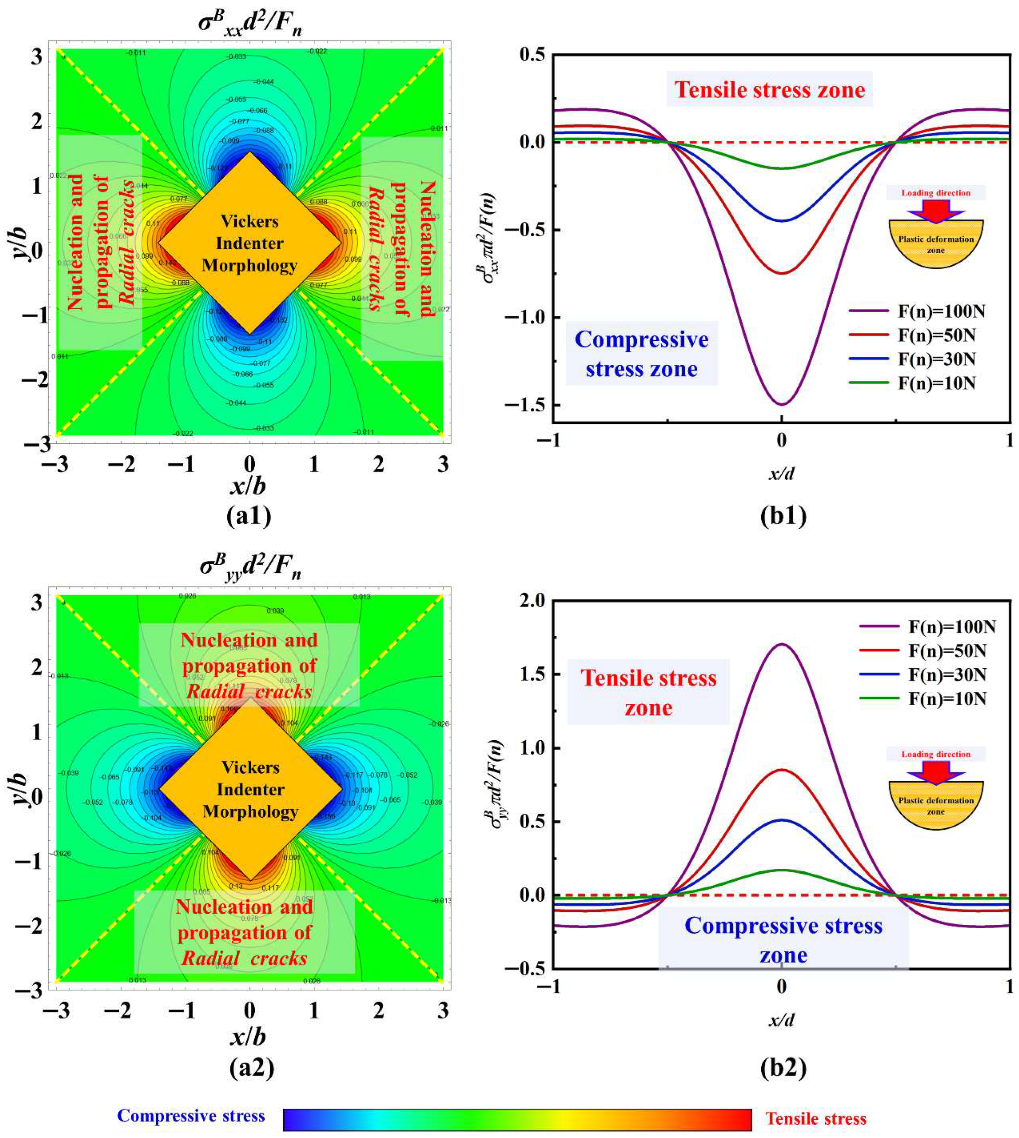 The stress field calculation results with the load of 1 kgf based on the Boussinesq field in the yoz plane under the parameters of c-orientation sapphire, and the curves of stress value variation with normal load at x/d = 0, are shown in Figure 17. In Figure 17(a1,a2), along the loading direction of the Vickers indenter, both σBxx and σByy have obvious tensile stress regions, which are the areas where median cracks nucleate and propagate. The curves in Figure 17(b1,b2) indicate that as the normal load increases, the tensile stress values for nucleation and propagation of median cracks will also increase with the increase of σBxx and σByy. Therefore, a larger normal load will make it easier for median cracks to nucleate and propagate, or in other words, the time for median crack nucleation will be shorter under a larger normal load. In Figure 17(a2,b2), there is also a tensile stress region near the z = 0 surface, which provides energy for the propagation of radial cracks, making them not only expand horizontally but also have a downward trend.