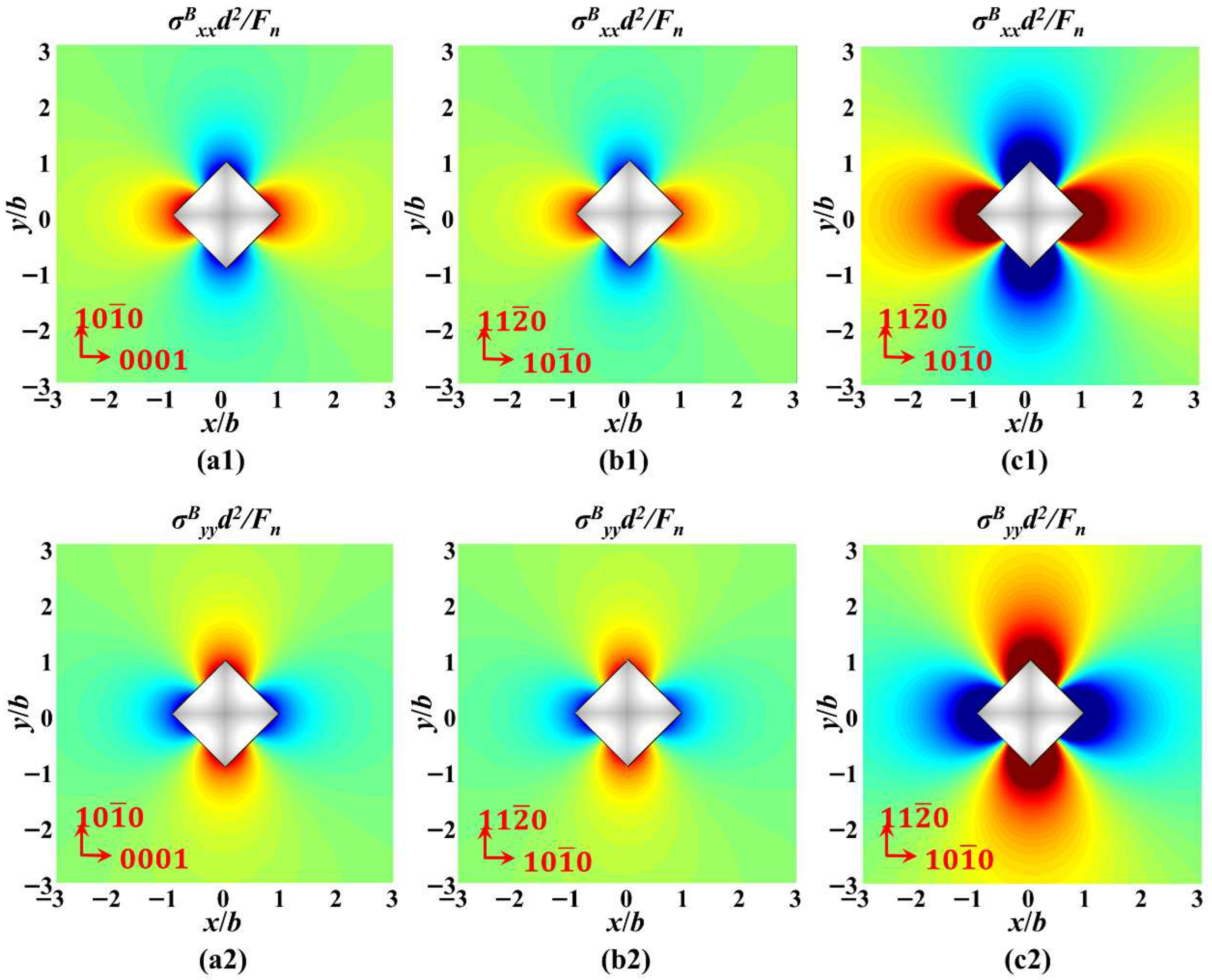 The stress field calculation results based on the Boussinesq field in the xoy plane: (a1) the stress values of a-orientation sapphire under a load of 1 kgf of σBxx, (a2) the stress values of a-orientation sapphire under a load of 1 kgf of σByy, (b1) the stress values of c-orientation sapphire under a load of 1 kgf of σBxx, (b2) the stress values of c-orientation sapphire under a load of 1 kgf of σByy, (c1) the stress values of c-orientation sapphire under a load of 10 kgf of σBxx, (c2) the stress values of c-orientation sapphire under a load of 10 kgf of σByy.