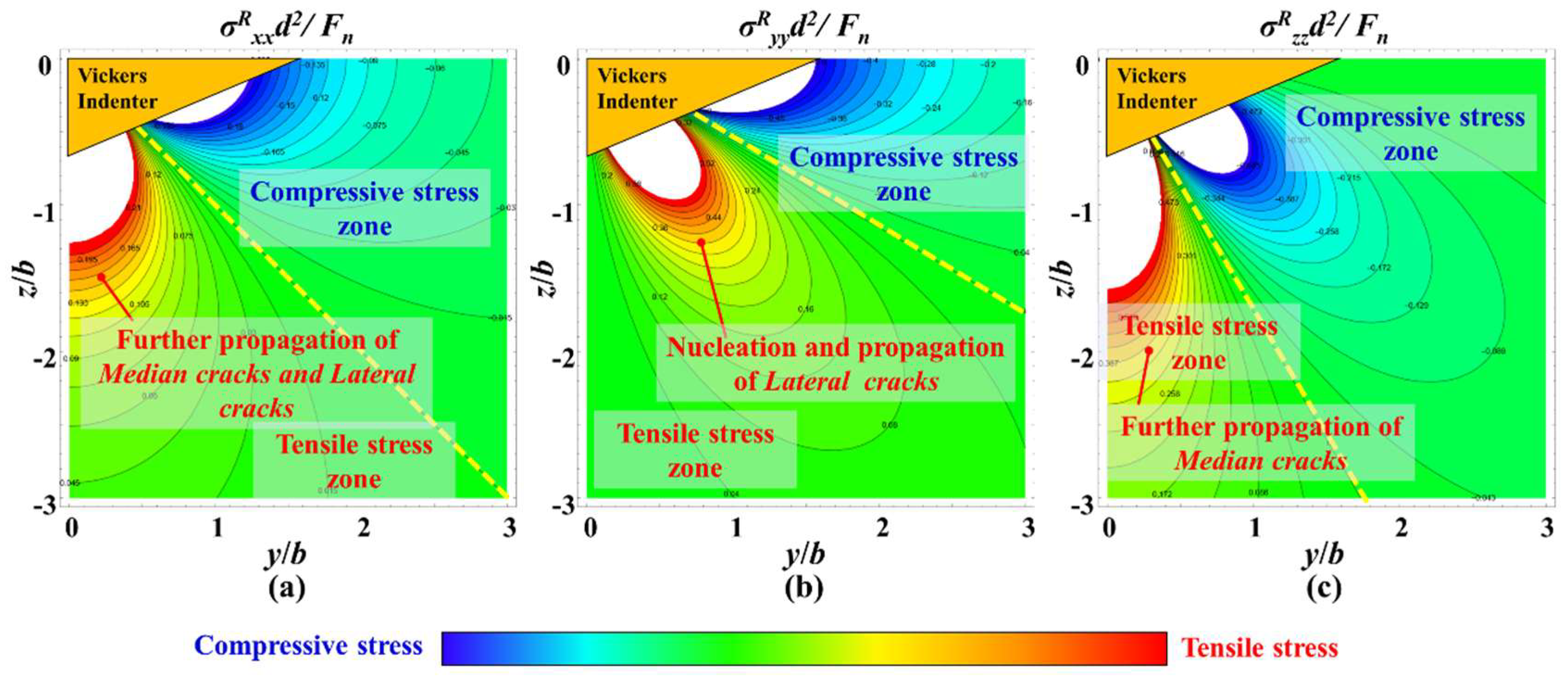 Residual stress field during Vickers indentation unloading process, (a) σRxx, (b) σRyy, (c) σRzz.