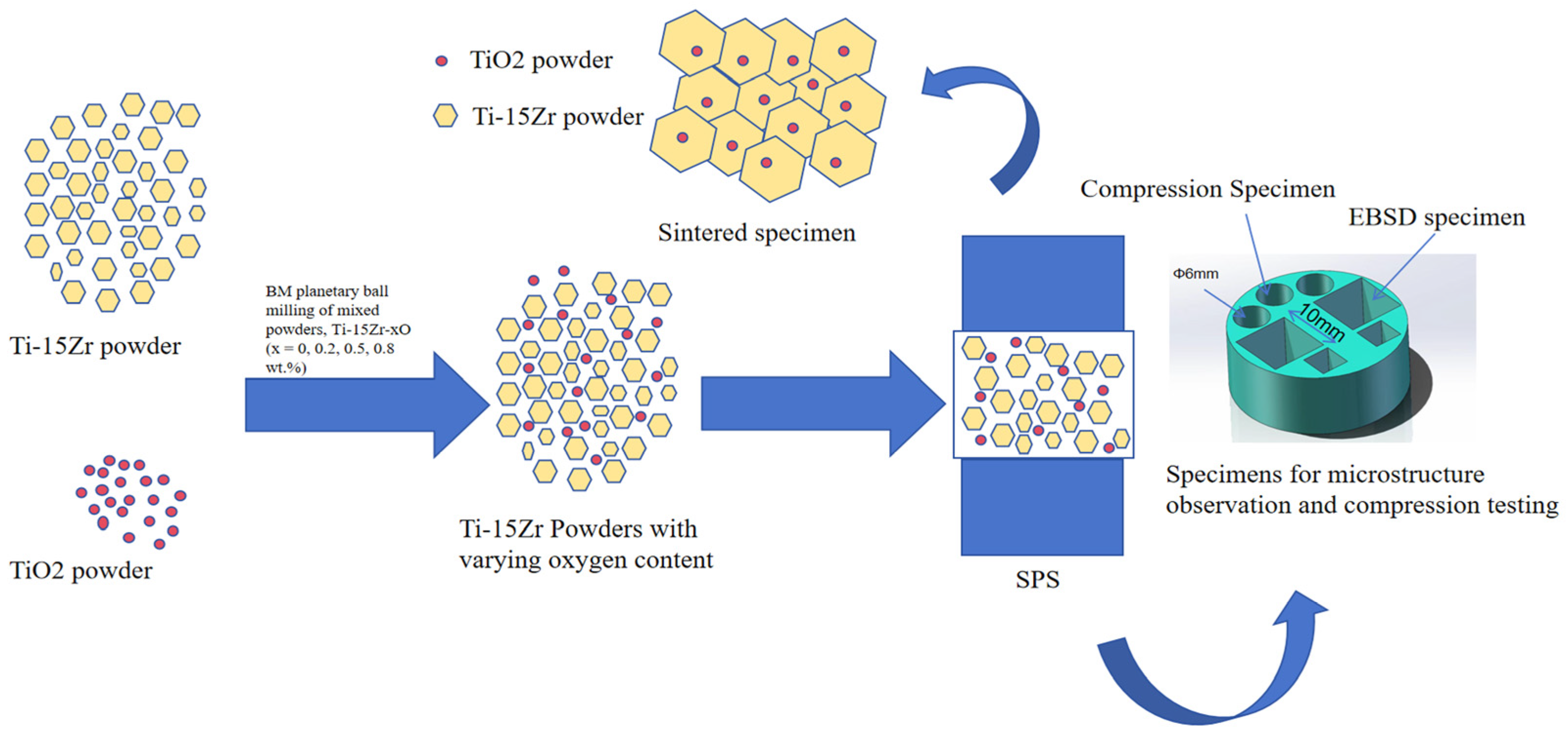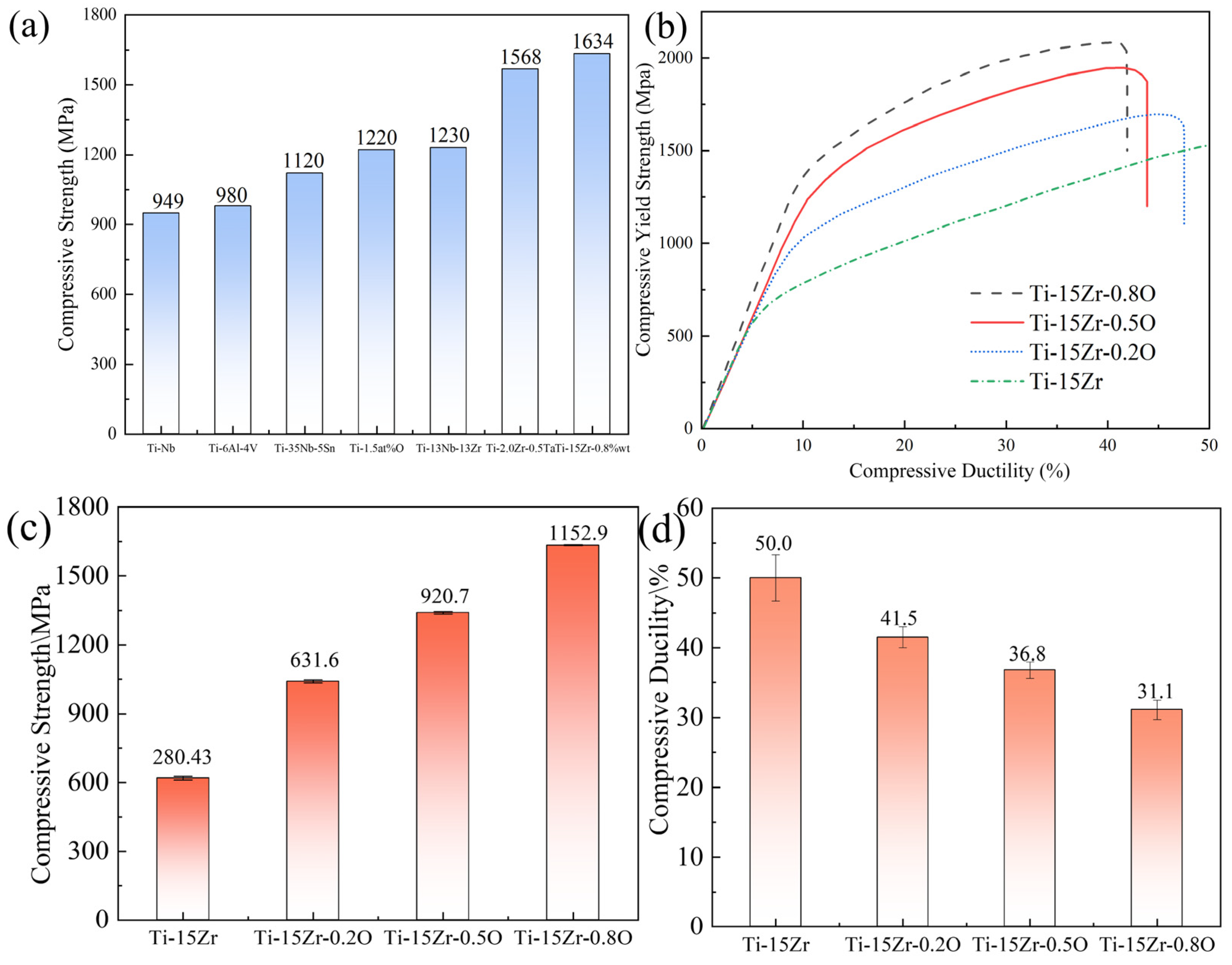 - The mechanical tests revealed excellent properties, which are a direct consequence of the dense and fine-grained microstructure fabricated by SPS. The mechanical tests revealed a strong correlation between oxygen content and strength. The compressive yield strength increased linearly from 619.24 MPa in the oxygen-free Ti-15Zr alloy to a remarkable 1634.18 MPa in the Ti-15Zr-0.8O alloy. This substantial strengthening was accompanied by a slight decrease in ductility. Fracture analysis of all samples showed a mixed-mode fracture, characterized by both ductile dimples and brittle cleavage-like features, indicating that the alloys retained a degree of plasticity even at very high strength levels.