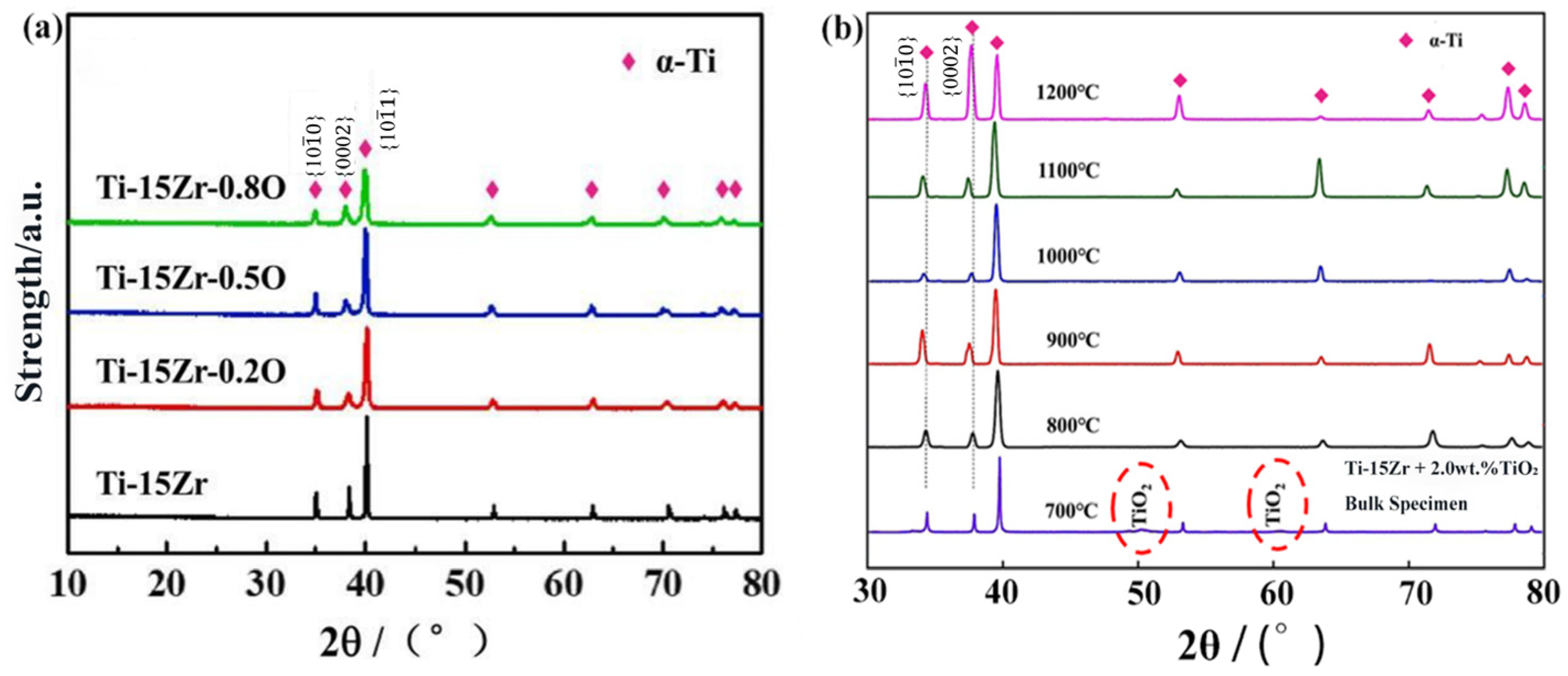 - Liu, S.; Wang, Y.; Zhang, H.; Chen, X.; Zhao, Y. Microstructure and Mechanical Properties of Ti–Zr–O Alloys with High Oxygen Contents Prepared by Powder Metallurgy. J. Alloys Compd. 2020, 849, 156605. [Google Scholar]