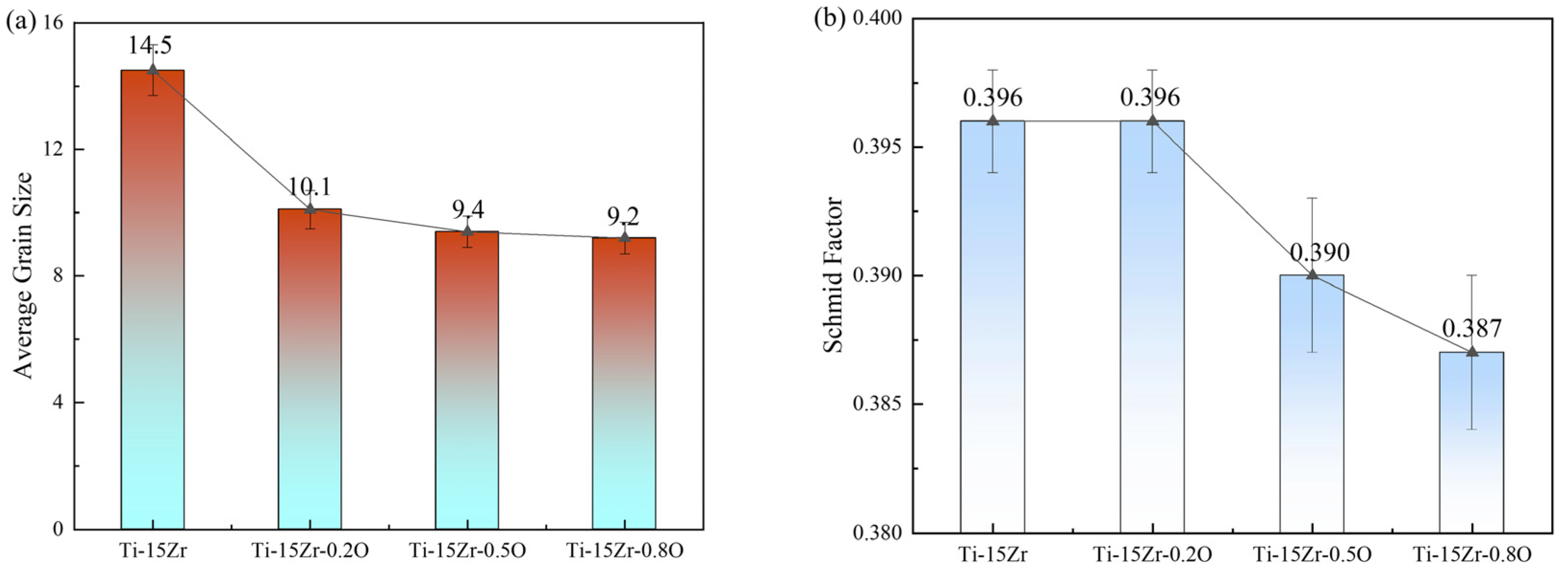 - Analysis of lattice parameters confirmed that oxygen atoms primarily occupy octahedral interstitial sites within the α-Ti matrix, causing lattice expansion. A quantitative assessment of strengthening mechanisms, based on the Labusch and Hall–Petch models, demonstrated that the observed strength enhancement is predominantly due to the solid solution strengthening effect from dissolved oxygen, while the contribution from grain refinement strengthening was found to be relatively minor.