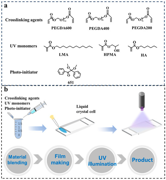 (a) Chemical structures of material. (b) Schematic diagram of the preparation process of PDLC film.