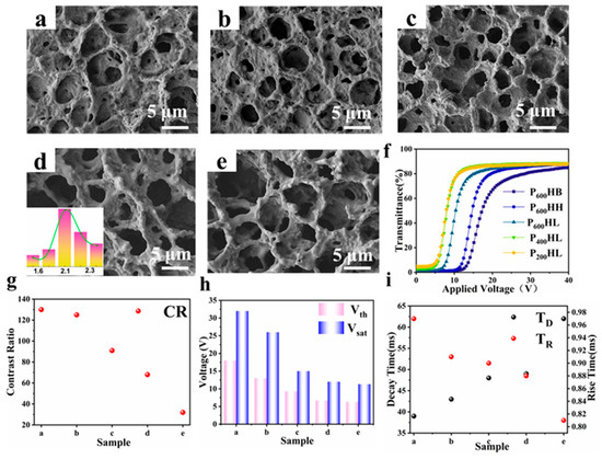 Micrographs of the polymer networks of samples (a) a, (b) b, (c) c, (d) d, (the insert is the pore diameter of the film) and (e) e; (f) the voltage-dependent transmittance curves; (g) CR of a–e samples; (h) Vth and Vsat of a–e samples; (i) TR and TD of samples a–e.