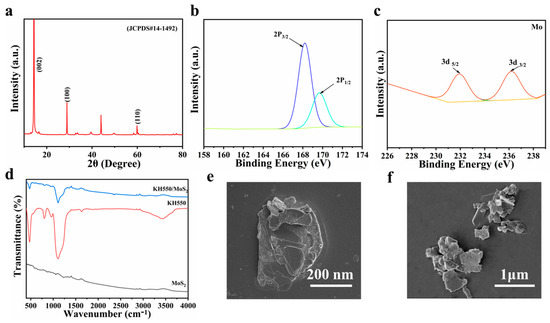 (a) XRD patterns; (b) S 2p spectrum; (c) Mo 3d spectrum; (d) FT-IR spectra of KH550, MoS2 and KH550/MoS2; (e,f) SEM micrographs of MoS2.