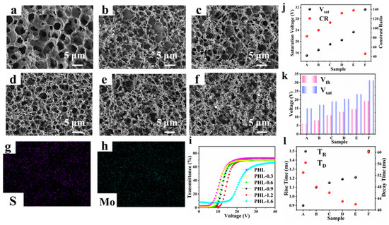 Micrographs of the polymer networks of samples (a) A, (b) B, (c) C, (d) D, (e) E and (f) F; (g,h) the EDS mapping images; (i) the voltage-dependent transmittance curves; (j) Vsat and CR of A–F samples; (k) Vth and Vsat of A–F samples; (l) TR and TD of samples A–F.