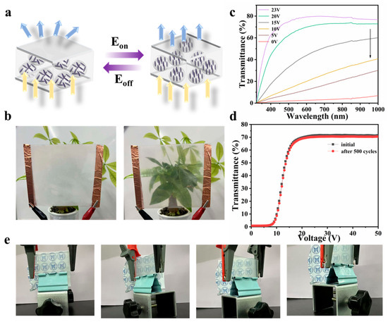 (a) The schematic diagram of PDLC smart window; (b) photos of PDLC-based smart window; (c) UV-visible transmittance spectra of PDLC smart window were measured at different voltages; (d) the transmittance of the spectra of the initial film and the film after 500 cycles; (e) photo display of PDLC film from different viewing angles.