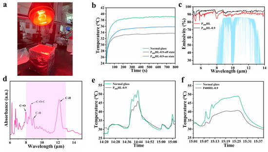 (a) Simulated sunlight irradiation test temperature device; (b) temperature change curve; (c) emissivity curve; (d) absorbance spectrum of PDLC film with ATR-FTIR spectroscopy; (e,f) outdoor test temperature change curve.