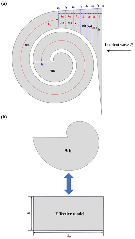 Below, the surface impedance of the structure is computed using the transfer matrix method (TMM). The TMM model is mainly based on the following assumptions: 1. the acoustic wave propagates in the form of a local plane wave within the infinitesimal segment; 2. the radial energy loss and the influence of higher-order modes can be ignored. In fact, the TMM is widely applicable to the frequency-domain analysis of chain structures (such as pipes and spiral channels) and can efficiently handle one-dimensional wave propagation problems. For instance, Liu et al. [] designed a ventilation broadband sound absorber based on Archimedean spiral units. They used the transfer matrix method to analyze the sound pressure–velocity transfer relationship between adjacent spiral units and calculated the overall structure’s sound absorption coefficient.