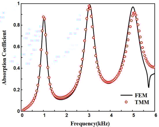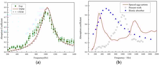 To further demonstrate the effectiveness of the present simulation method, we have added a test case. The research object is an origami-based acoustic metamaterial and the basic principle of sound absorption is mainly the Helmholtz resonator. Detailed theoretical results can be found in reference [], which has also provided a theoretical model to validate numerical results. As shown in Figure 5b, the results show that the simulation results are in good agreement with the theoretical predictions, which to some extent indicates the effectiveness of the simulation.