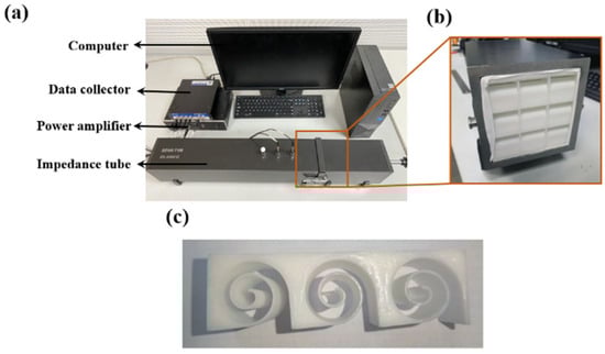 To further validate the accuracy of the theoretical and simulation calculations, experiments were conducted using the SW422 (BSWA Technology, Beijing, China) impedance tube, as shown in Figure 10a. Acoustic absorption tests were performed on Archimedean spiral metamaterials using the VA-Lab testing system and the transfer function method, as depicted in Figure 10. To minimize the variability in experimental results, an average of 12 experimental data sets were taken. The structures were 3D printed using white resin, with overall dimensions of 100 mm × 100 mm × 30 mm. For this rectangular waveguide, the cut-off frequency fc,m,n of mode (m, n) is given by the following formula . Substituting the data yields 1715 Hz. The frequency range we measure is 200 Hz-1600 Hz, which satisfies the plane wave assumption. Three samples are manufactured under the same controlled conditions and only one of them is shown in Figure 10c for brevity.