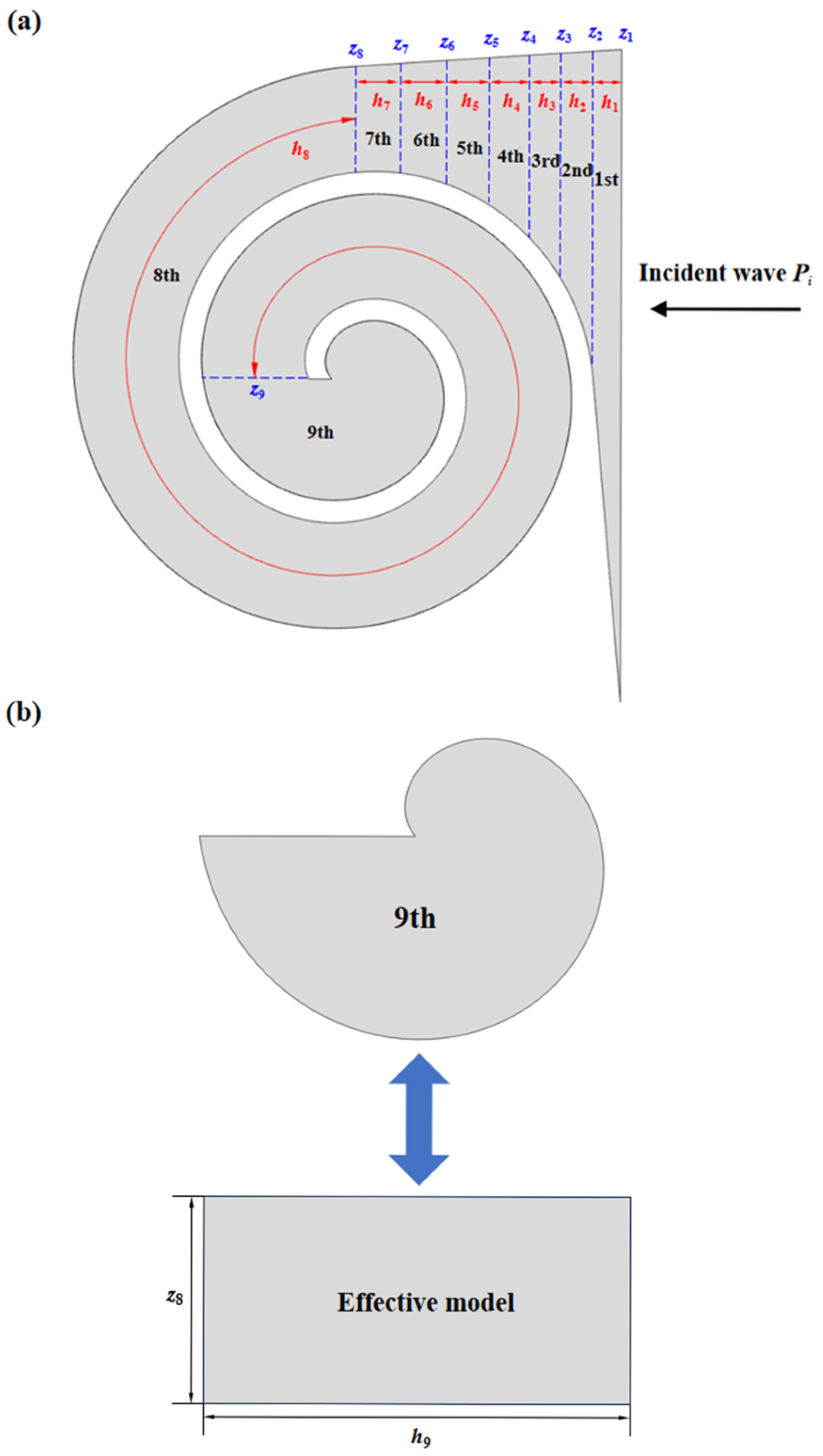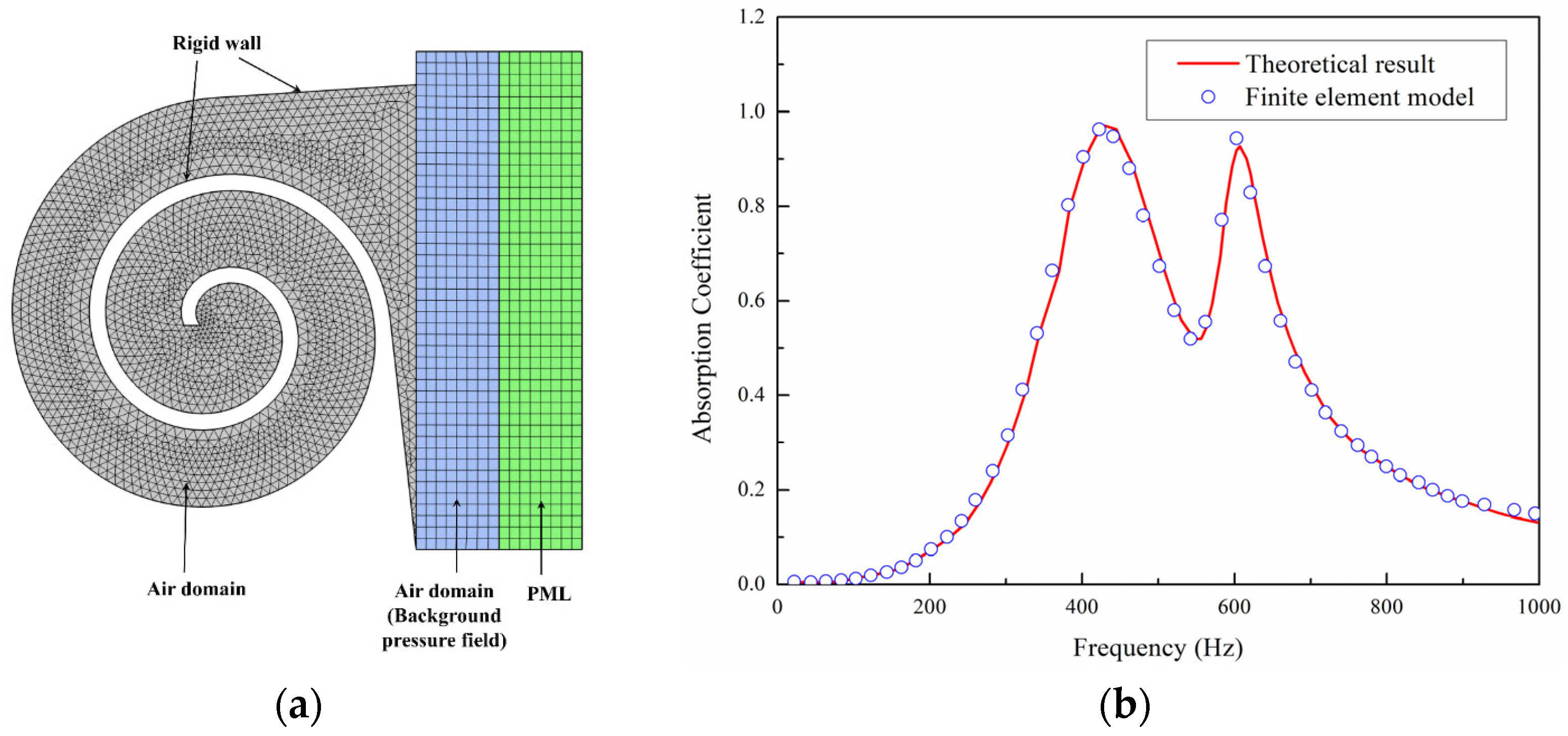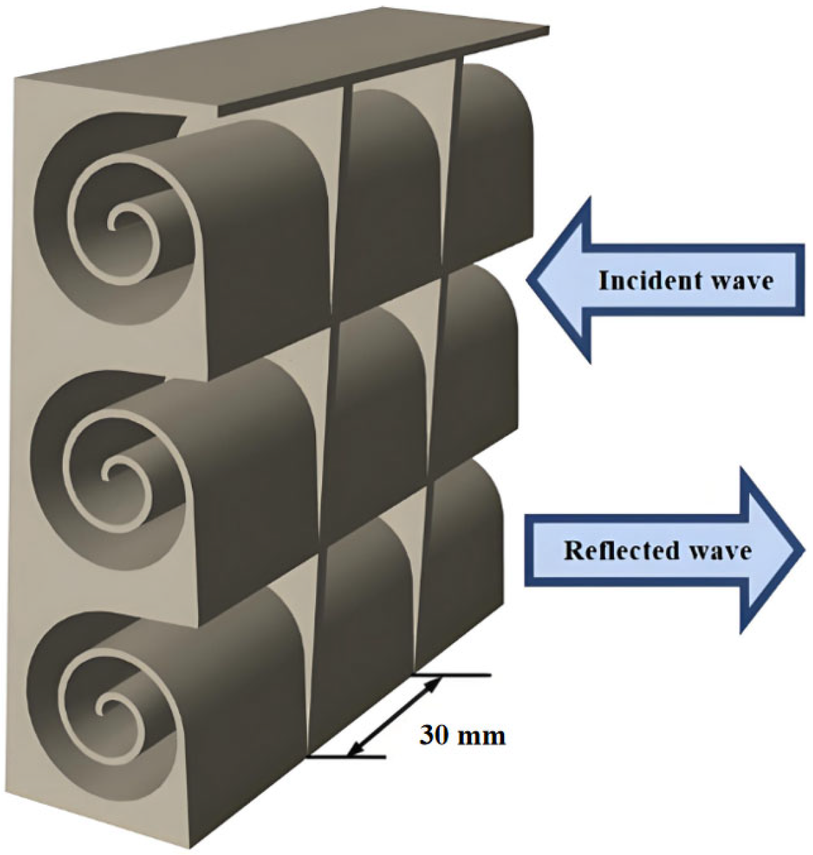 32] designed a ventilation broadband sound absorber based on Archimedean spiral units. They used the transfer matrix method to analyze the sound pressure–velocity transfer relationship between adjacent spiral units and calculated the overall structure’s sound absorption coefficient.