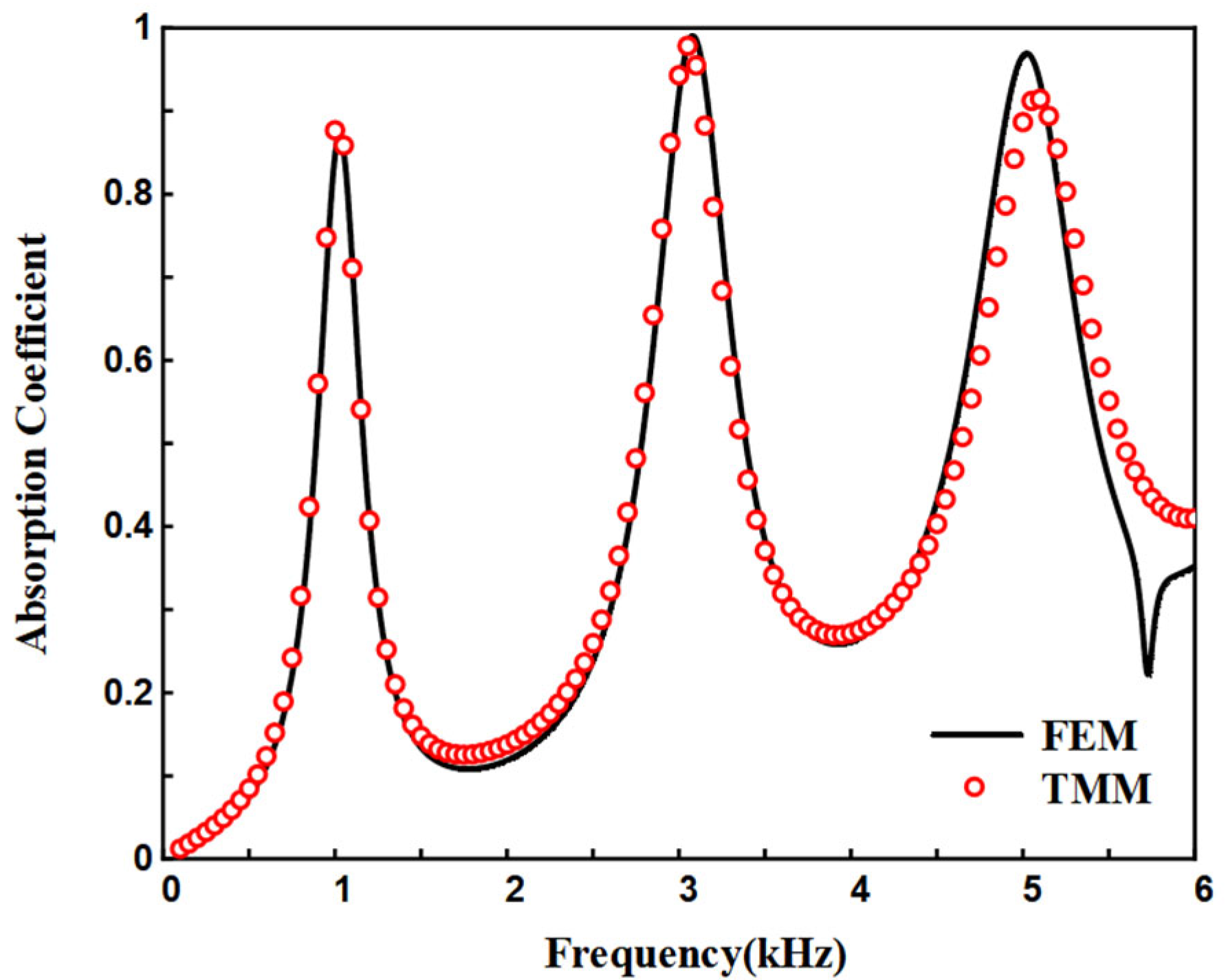 The accuracy of the theoretical model was validated by comparing the acoustic absorption coefficient curves obtained from the ASCC theoretical model, simulation results, and experimental results in the frequency range of 200–1600 Hz, as shown in