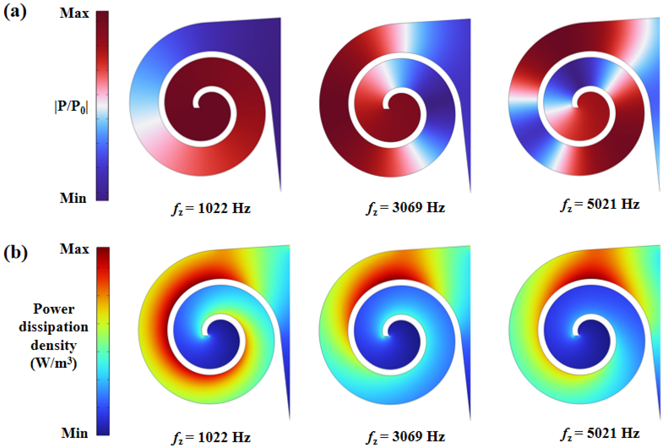 Notably, our primary objective was to achieve sound absorption in the broadband frequency domain. The spiral channel functions primarily as an acoustic resonator. The total spiral path length L is designed to be approximately a quarter-wavelength (λ/4) of the target resonant frequency. This L is determined by the number of turns, N, and the gap between channels g (i.e., L ≈ 2πRN for an idealized spiral, where R is the average radius). The width and depth of the channel were chosen to ensure a high aspect ratio, which suppresses higher-order modes and maintains the validity of the plane-wave assumption within our frequency range of interest. The outer diameter was constrained by practical application size limits.