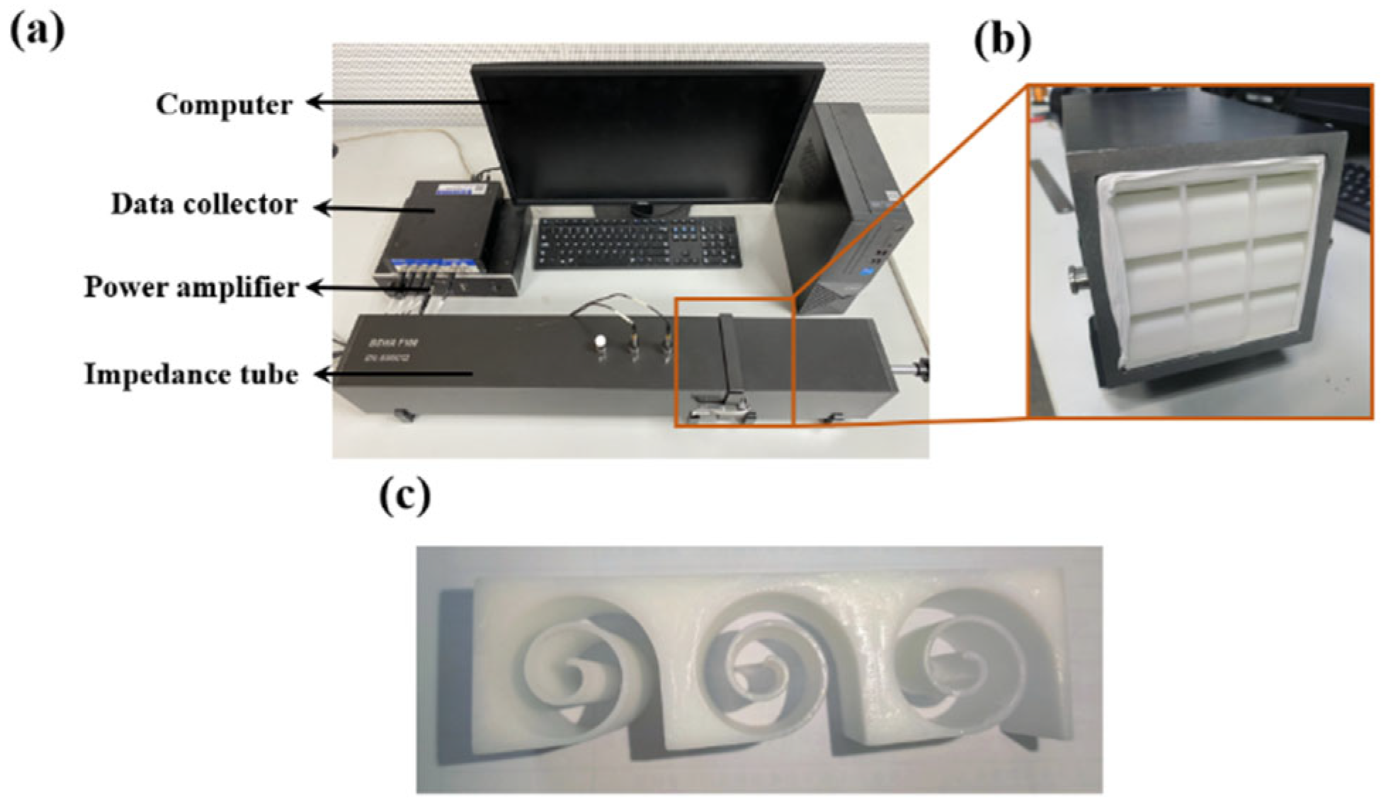Figure 10a. Acoustic absorption tests were performed on Archimedean spiral metamaterials using the VA-Lab testing system and the transfer function method, as depicted in
