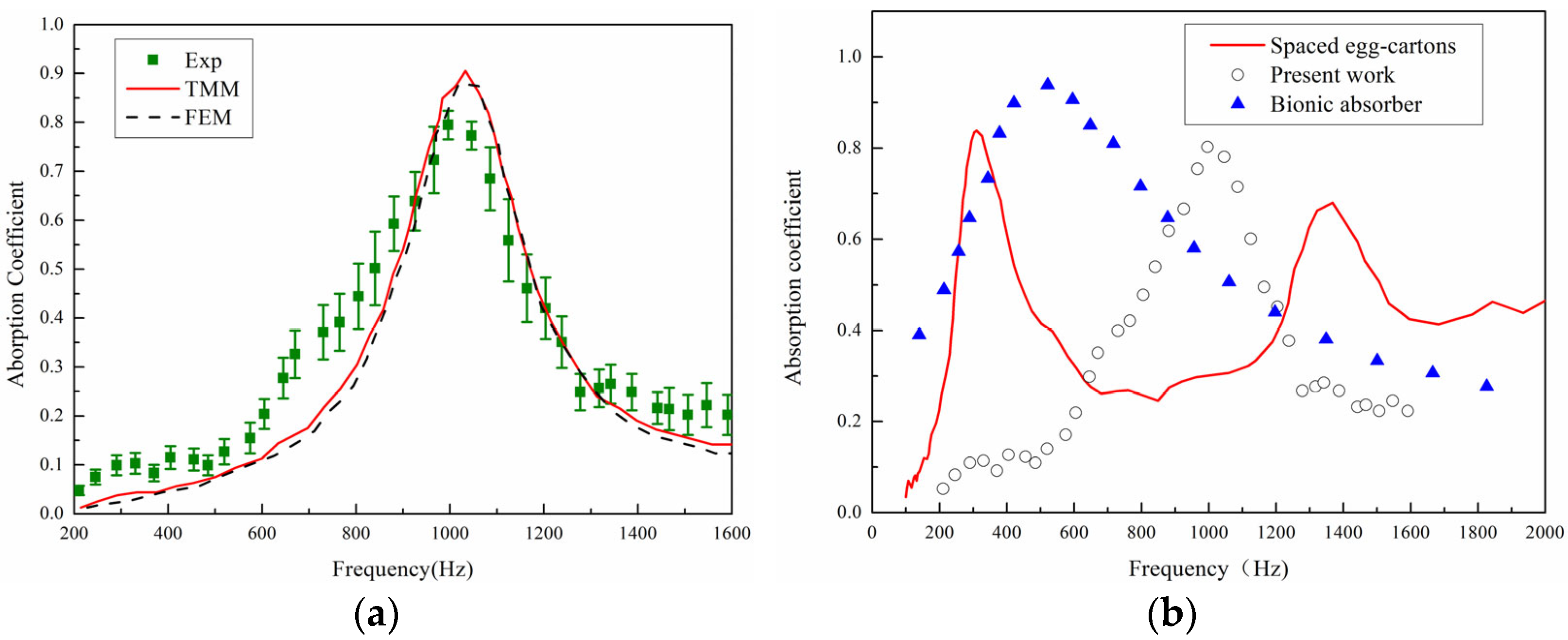 Figure 11a. The experimental results shown are average results with error bars of three tested specimens. It is evident that the absorption curves obtained from the three methods exhibit the same trend, with a similar number of absorption peaks and peak frequencies that are very close, thus confirming the predictive accuracy of the theoretical model. Discrepancies between the results may stem from several factors: firstly, sample fabrication errors, such as structural dimension inaccuracies due to the precision limitations of 3D printing; secondly, experimental testing errors, such as gaps between the sample and the inner wall of the impedance tube and the difficulty in achieving ideal normal incidence of plane waves during the experimental process. Experimental measurements of density and damping have not been conducted in this work and internal voids/porosity have not been considered in the numerical simulation. Micro-CT scans or homogenization techniques to account for porosity in simulations can be incorporated in the future.