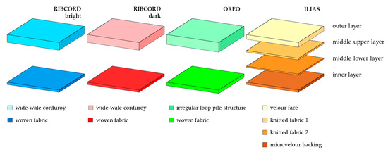 The subject of the research was 4 textile products with potential use as upholstery materials: three woven fabrics: RIBCORD bright, dark RIBCORD dark, OREO, and knitted fabric: ILIAS (Glormeb Group, Warsaw, Poland). The adjectives “bright” and “dark” refer to the actual shades of the two RIBCORD fabrics. In reality, RIBCORD bright is white, while RIBORD dark is gray. To enhance the clarity of the data presented in the article, the authors assigned artificial contrasting colors (blue, red, green, and orange) to the tested textiles. These colors were used in all diagrams, photos, and graphs. All three woven fabrics had a two-layer structure, while the ILIAS knitted fabric consisted of four layers. Scheme of the layered structure of the tested textiles is presented in Figure 1.
