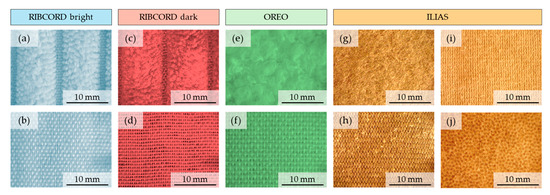Optical microscopy images of tested textiles. RIBCORD bright: (a) outer layer, (b) inner layer; RIBCORD dark: (c) outer layer, (d) inner layer; OREO: (e) outer layer, (f) inner layer; ILIAS: (g) outer layer, (h) middle upper layer, (i) middle lower layer, (j) inner layer.