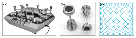 Abrasion resistance testing is one of the most important parameters required when evaluating textile furniture products, and it has a significant impact on determining their quality. The studies were conducted according to a standardized test procedure according to the International Standard EN ISO 12947-2 [34]. A circular sample fixed in a sample holder, under a certain load, performing a translational movement along the paths of the Lissajous figure, is abrased by an abrasive medium (standardized flat product). The sample holder also rotates freely around its axis, perpendicular to the sample surface. The abrasion resistance rating of a flat textile product is determined on the basis of the inspection interval to the breakdown of the samples. The inspection interval is determined by the sample breakdown. The number of rubs is recorded at which the sample breakdown is not yet observed. M235 Martindale apparatus made in SDL ATLAS (Charlotte, NC 28217-2956, USA) for testing the resistance of flat fiber products for abrasion and pilling, the sample holder and Lissajous Figure are shown in Figure 3.