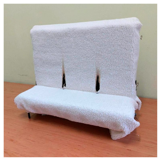 The tested upholstery system is exposed to an ignition source in the form of a 35 mm high flame, generated by a special propane-fueled burner. The flame is regarded as equivalent to a match flame. The burner is positioned along the junction of the vertical (backrest) and horizontal (seat) parts of the specimen. The exposure time of the system to the flame is 15 s. At the moment the burner flame is applied to the tested specimen, a timing device (stopwatch) is activated. The course of the test is then observed, and, in accordance with the requirements of the standard, phenomena such as ignition of the specimen, glowing, and smoldering are recorded. After the flame is removed from the tested specimen, the system is further observed for the occurrence of the aforementioned phenomena. After 120 s, if no visible signs of burning, smoldering, or glowing of the upholstery system are present, the system is dismantled to check for possible non-visible internal effects (smoldering or glowing) within the filling material. Based on this examination, the final evaluation and classification of the tested upholstery system is made. If no progressive smoldering or glowing of the filling is found, the result is recorded as “no ignition,” and the tested system is deemed to meet the requirements of the standard [26].