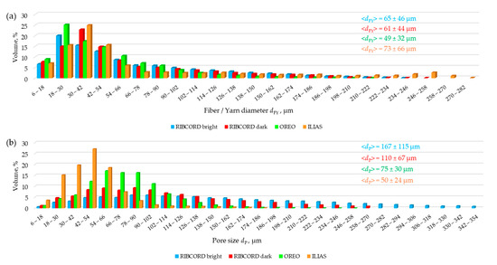 Figure 6a shows the fiber/yarn diameter distributions dFY in the tested textiles. In all tested textiles, individual fibers occur separately, essentially only in the outer layer. In the inner layer, they are formed into yarns, creating woven fabrics (RIBCORD bright, RIBCORD dark, and OREO) and knitted fabrics (ILIAS). The fibers in the yarn are parallel, twisted, and adjacent to each other. The spatial resolution of the micro-CT (voxel size: 6 µm) makes it impossible to identify adjacent individual fibers, treating them as objects of larger diameter. Therefore, in the presented distributions, the intervals with higher diameters correspond to the diameters of objects formed from fibers forming yarns in the woven and knitted fabrics of the tested textiles.