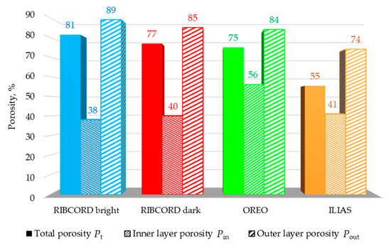 Because the woven and knitted fabrics comprising the layers of the tested textiles have only open pores, porosity is a parameter that correlates with air permeability. Air permeability is one of the important performance parameters of upholstery textiles, influencing heat transfer through the textile and moisture wicking. The layer that determines the air permeability of textiles is usually the least porous layer. High-resolution computed microtomography enabled the examination of the porosity of each layer separately and the calculation of the total porosity of the textiles, resulting from the porosity of their individual layers. Figure 7 shows the porosity results for the tested textiles. For each textile product, the total porosity Pt, inner layer porosity Pin, and outer layer porosity Pout were calculated. In the case of ILIAS, the porosity of the inner layer (microvelour backing) was calculated by taking into account the contribution of two adjacent thin layers: the middle upper (knitted fabric 1), and the middle lower (knitted fabric 2). The microtomography results show that the RIBCORD bright woven fabric is the most porous textile (Pt = 81%), while the ILIAS knitted fabric is the least porous (Pt = 55%). The same relationship applies to the porosity of the outer layer: Pout = 89% for RIBCORD bright and Pout = 74% for ILIAS. The observed correlation between total porosity and the porosity of the outer layer results from the significantly larger volume of these textiles in the outer layer compared to the other layers. On the other hand, RIBCORD bright has the least porous inner layer (Pin = 38%), while OREO has the most porous one (Pin = 56%).