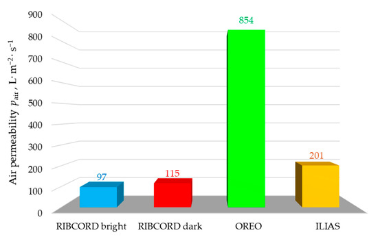Figure 8 presents the results of textile air permeability—pair tests. The graph shows that the OREO has the highest pair = 854 L·m−2·s−1. This woven fabric is characterized by very good breathability. This type of upholstery textile is well-suited for air-conditioned interiors or where high ventilation is required.