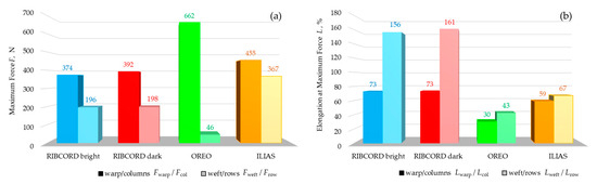 (a) Maximum force of tested textiles, (b) Elongation at maximum force of tested textiles.