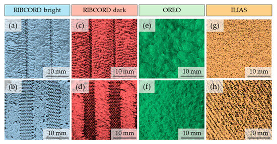 The visualizations can be used to identify the layers constituting the four tested textiles. The visualizations show a clear difference in thickness between the outer and inner layers in three fabrics (RIBCORD bright, RIBCORD dark, and OREO). In the case of ILIAS, the two knitted fabrics constituting its two middle layers are tightly bonded and, together with the inner layer (microvelour backing), form part of a textile product with a thickness similar to that of the inner layers of the other three woven fabrics. Furthermore, it can be observed that the outer layer in each of the four tested textiles is composed of separate fibers that are not spun into yarns, which is why it is characterized by greater fluffiness and transparency compared to the inner layer.
