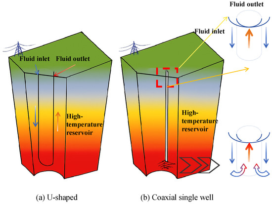 This study investigates deep geothermal development in the D22 well area of the Xiongan New Area by employing a CLGS for subsurface heat recovery. Two representative system configurations are considered: a U-shaped well and a coaxial single-well structure (Figure 2). The U-shaped well features a relatively simple geometry and is better suited for shallow, low-permeability reservoirs. In contrast, the coaxial single-well configuration is optimized for deep geothermal environments, offering greater heat exchange capacity and reduced maintenance demands [21,22,23]. In both systems, heat is extracted from the geothermal reservoir through a subsurface pipeline network and transferred to the working fluid, which circulates back to the surface where the thermal energy is released.
