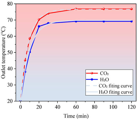 During the subsequent steady-state phase, the outlet temperature of the CO2 system stabilizes at 76.8 °C, while that of the water system levels off at 69.2 °C. Exponential curve fitting of the temperature-time profiles indicates that the thermal response behaviors of the two systems conform to the following relationships governing equations are given in Equations (10) and (11):