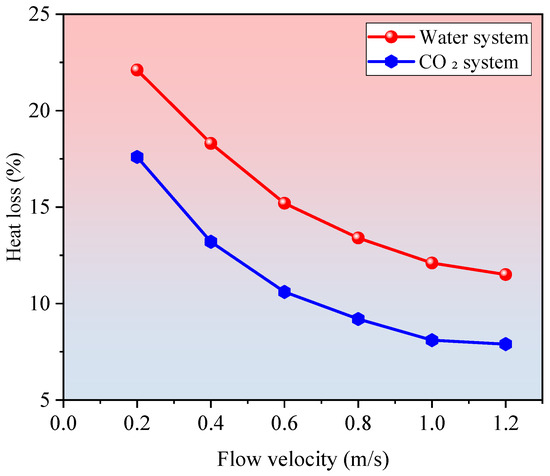 Comparison of wellbore heat loss ratio versus flow velocity for H2O and CO2 systems. CO2 shows 3–5% lower losses across all conditions.
