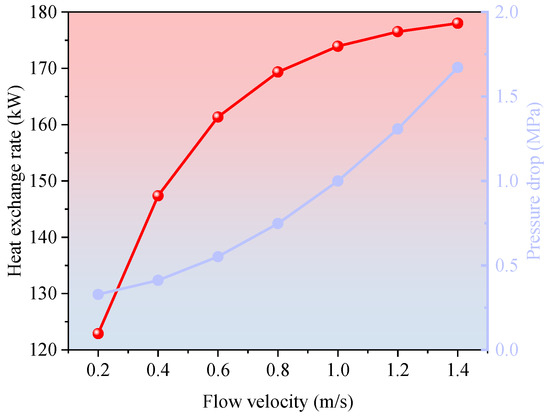 As shown in Figure 6, the system’s heat transfer rate increases sharply as the circulation flow velocity rises from 0.2 m/s to 1.4 m/s, growing from 96.4 kW to 174.2 kW and exhibiting a clear logarithmic trend. In the lower velocity range, the enhanced flow significantly improves the working fluid’s heat-carrying capacity, thereby increasing the heat flux through the heat exchange section per unit time and improving the overall thermal recovery rate.