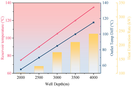 Figure 7 explores the variation in geothermal response with increasing well depth for the single-well coaxial system using CO2 as the working fluid at a flow velocity of 1.0 m/s. As the well depth increases from 2000 m to 4000 m, formation temperatures are estimated using a linear geothermal gradient of 3.8 °C/100 m, with a surface temperature baseline of 20 °C. Under this gradient, the formation temperature increases from 75 °C to 135 °C, while the outlet temperature differential expands from 55 °C to 105 °C. Correspondingly, the heat exchange rate improves from 102 kW to 153 kW—representing a 50% increase.