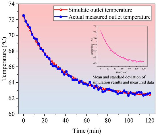 To validate the transient behavior of the model, the simulated start-up response (0–120 min) was compared with field measurements from the D22 well (Figure 9). The root-mean-square error (RMSE) between simulated and measured outlet temperatures during this period is 1.8 °C, indicating good agreement in dynamic response. In order to validate the applicability and predictive capability of the numerical model in deep closed geothermal systems, this study selected the D22 well in the Xiongan New Area for field engineering comparison. The D22 well is a deep carbonate rock thermal reservoir system with a drilling depth of 3080 m and a formation temperature of 104.7 °C. Following acid stimulation enhancement, effective fracture channels were formed and a closed-loop circulation mode using CO2 was employed for on-site heating tests. Comparing the model’s predictions with the measured data, including outlet temperature, heating power and heating area, allows us to further evaluate its accuracy and adaptability.