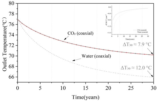 Long-term outlet-temperature evolution for CO2 and water over 30 years.