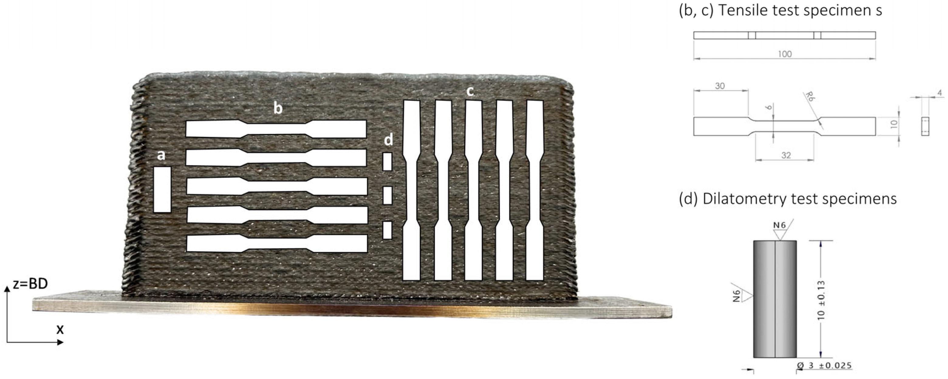 Figure 3). A 5 mm thick section was taken at mid-height in the building direction from the manufactured wall (a) for the microstructural, compositional, and hardness analysis. Ten tensile test specimens were obtained using Electric Discharge Machining (EDM) method, five from the horizontal orientation (b) and five from the vertical orientation (c), according to the ASTM E8M standard. To perform dilatometry tests, three specimens were machined in the growth direction of the wall (d).