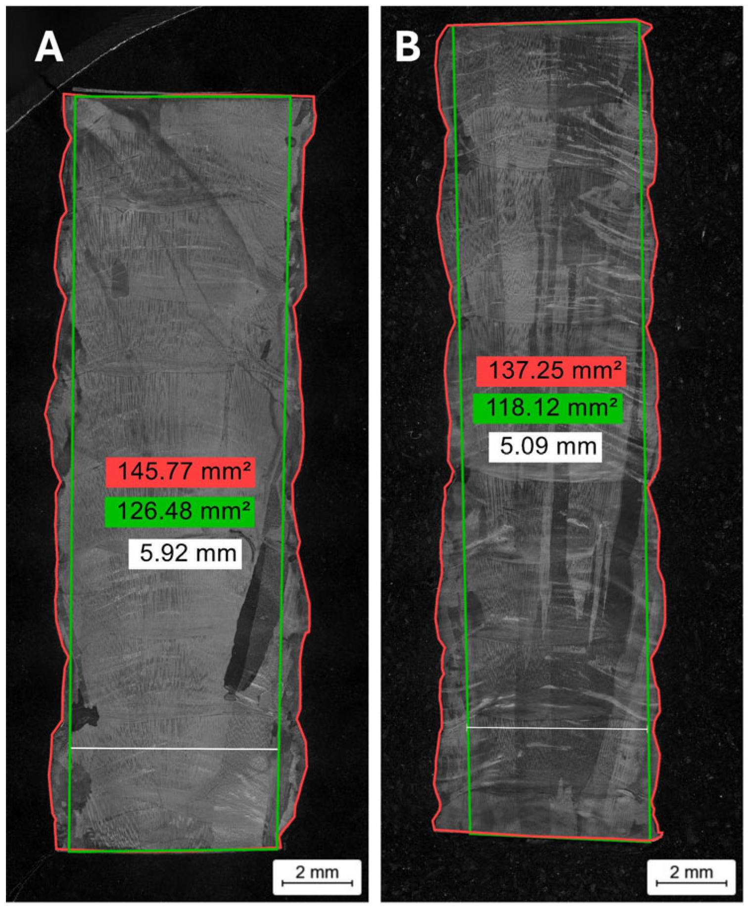 The microstructural characterization reveals that under the same manufacturing strategy (circular single weld bead), both single and double arc wire processes result in a columnar grain structure aligned parallel to the build direction (Z-axis). However, in Twin mode, larger grain widths are obtained. This may be due to several reasons. One factor that may contribute to the observed differences is the effect of heat input. The Twin welding mode employs two electric arcs, which can significantly increase the total energy delivered to the material. In the present study, the heat input values for Samples A and B were 316.24 KJ/cm and 316.37 KJ/cm, respectively. These values are notably higher than those reported in a previous study using the same deposition strategy but with a single arc, where the heat input was 204 KJ/cm [